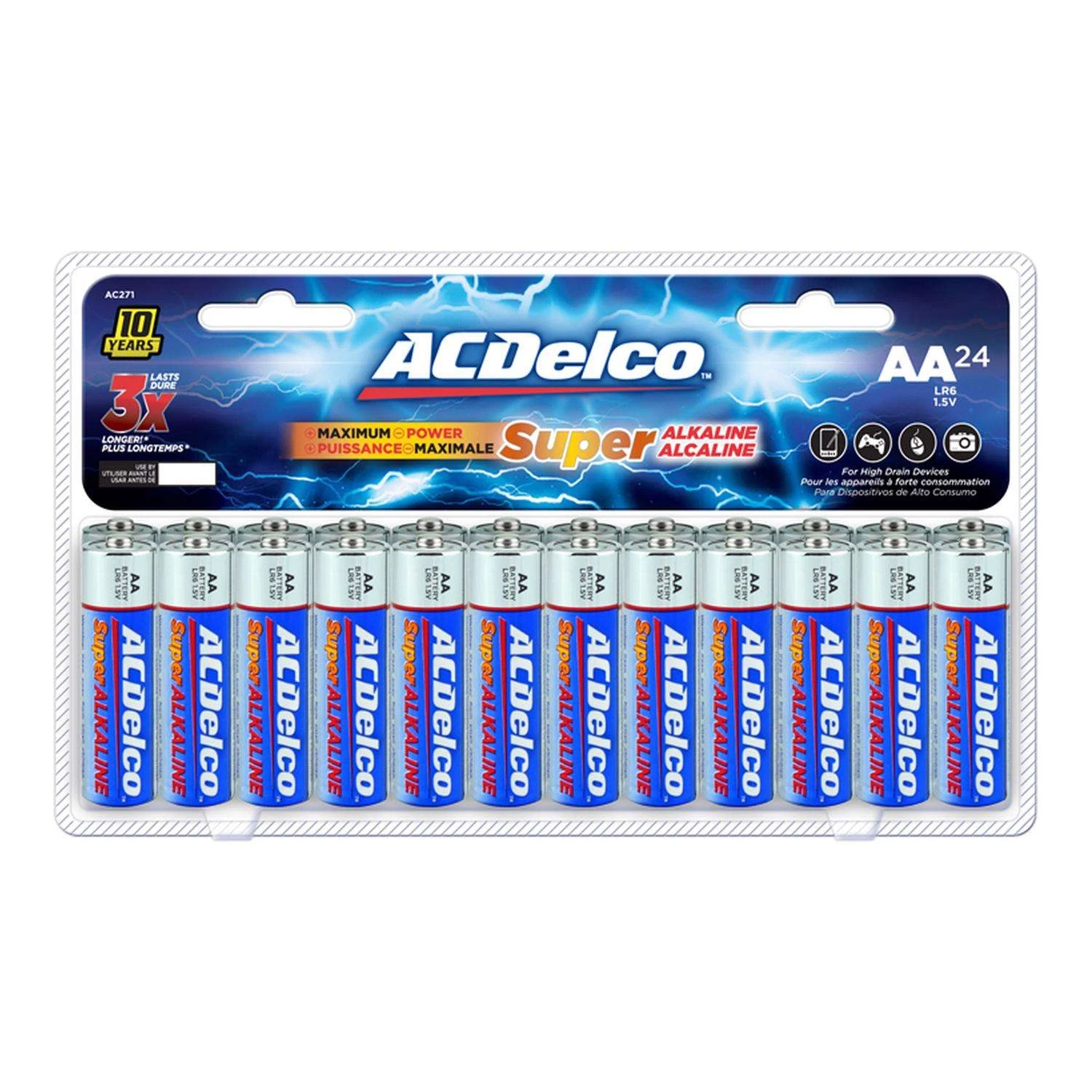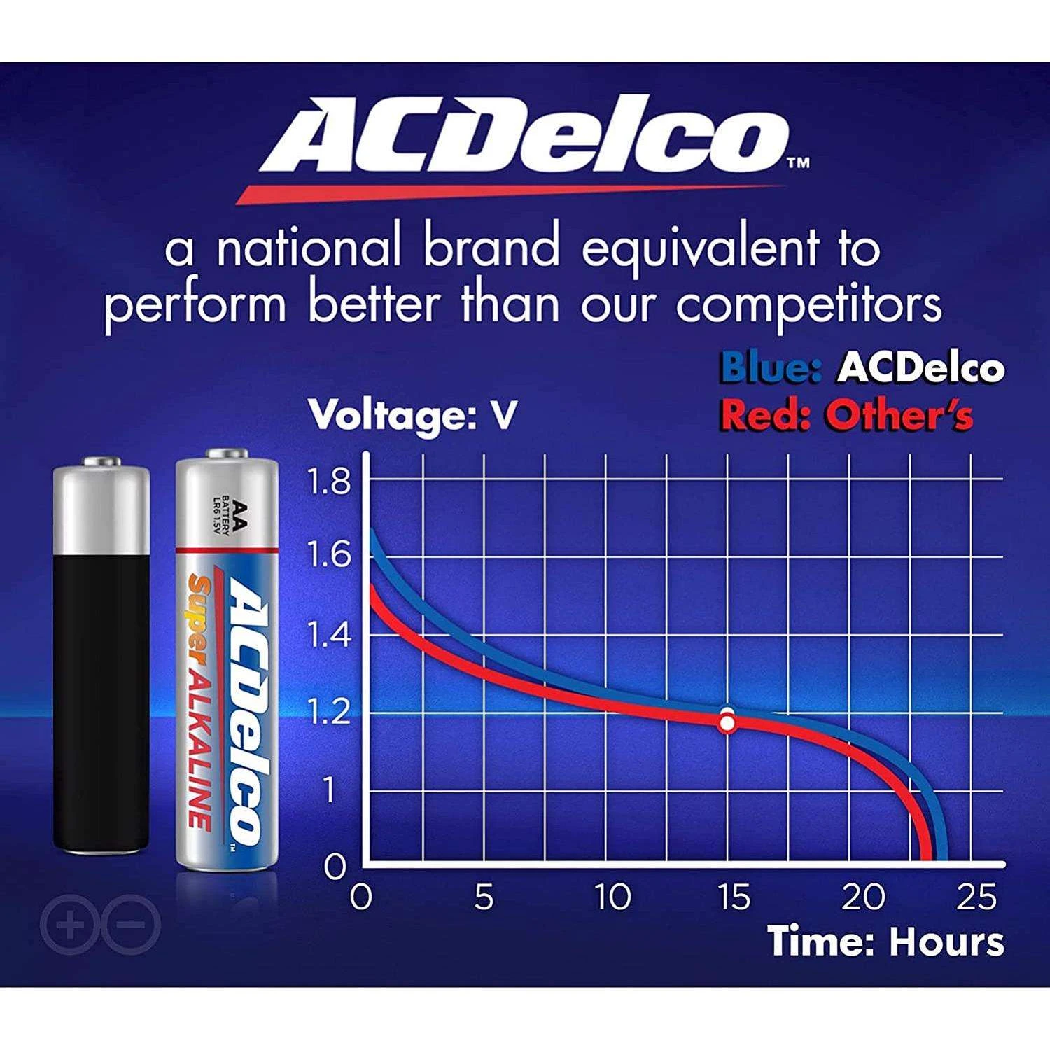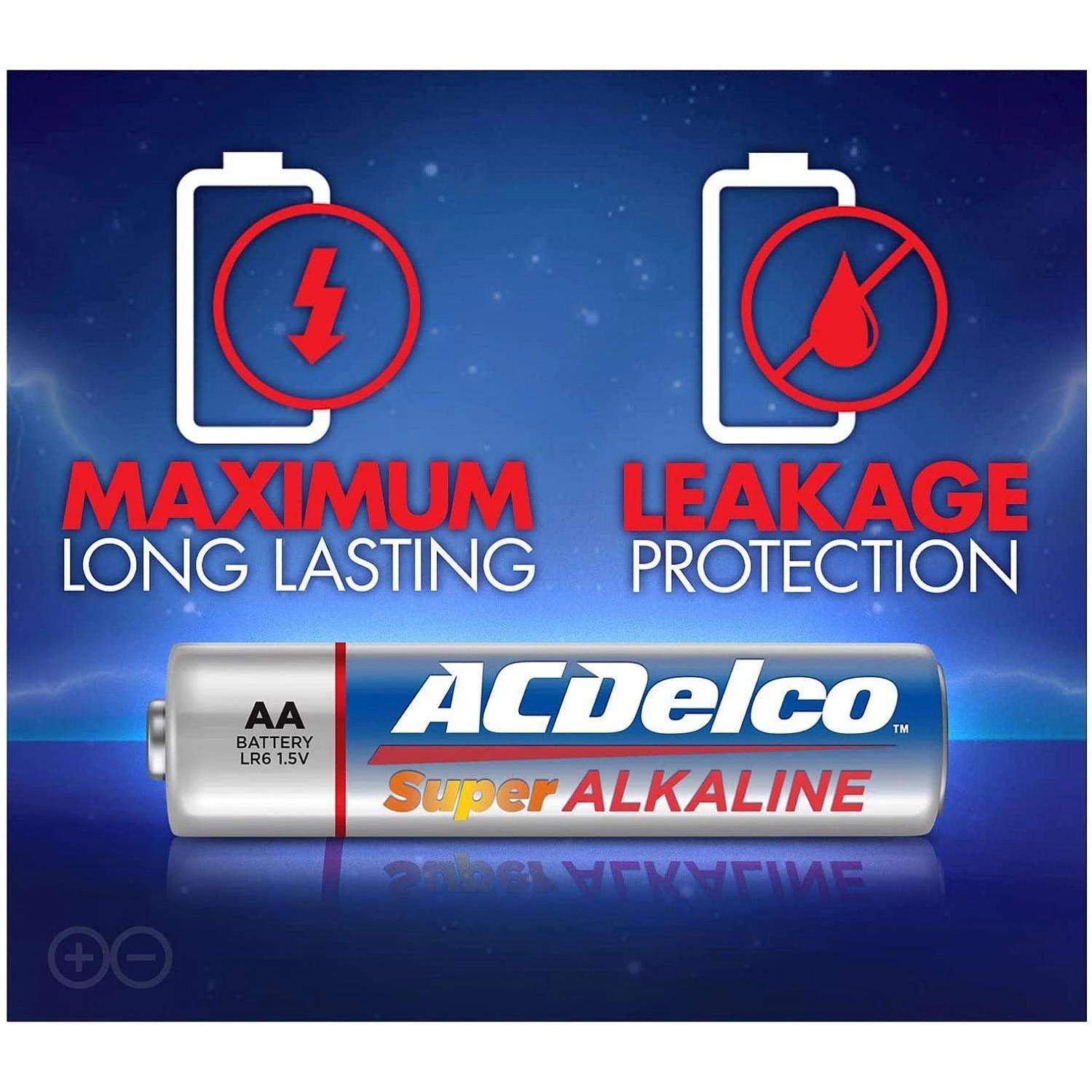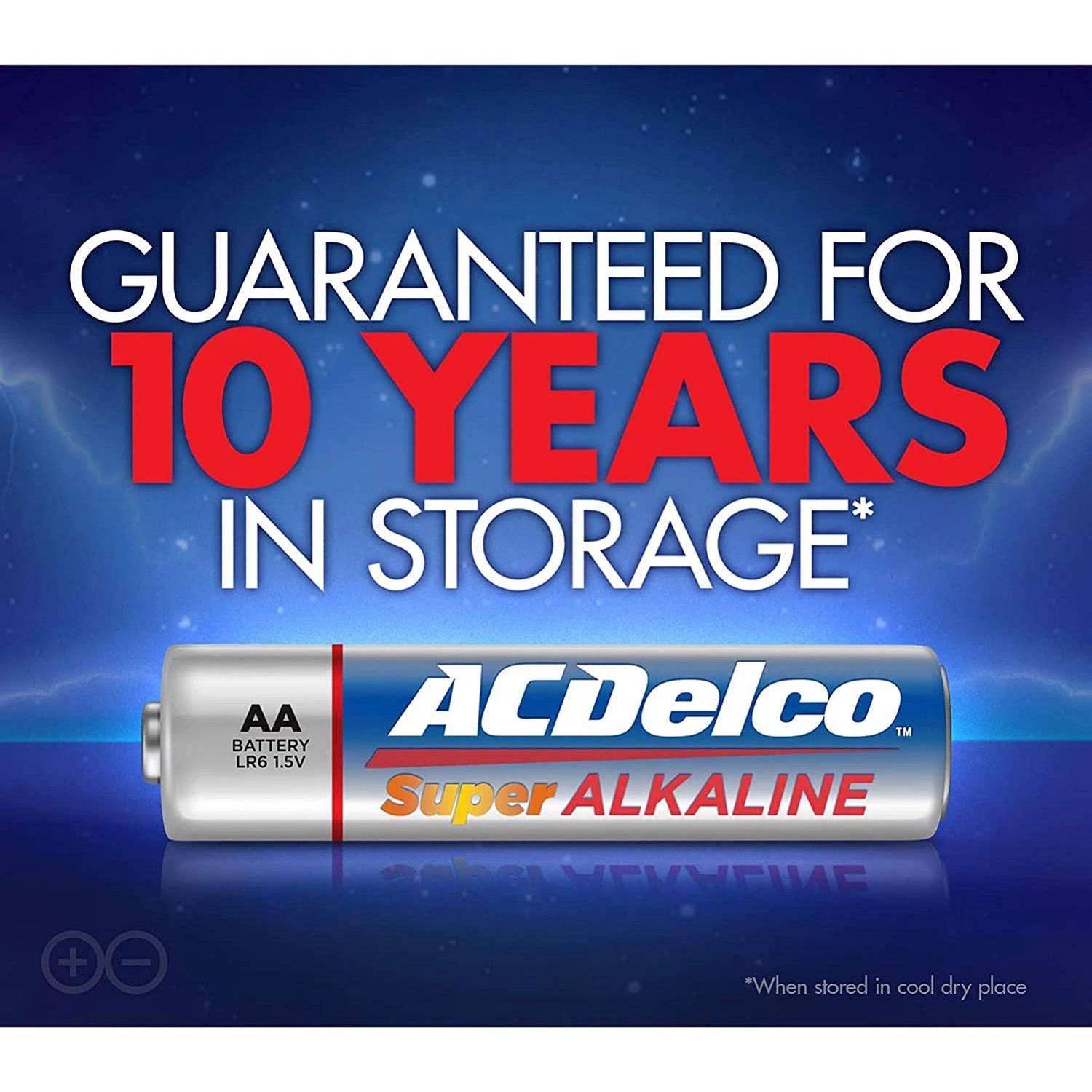 Everyone wants a brand they can trust. Dependable and reliable, the ACDelco brand represents quality batteries and products. Super alkaline batteries are equipped with advanced technology you can count on. Performs better than the competition in high-drain and super high-drain devices and they provide consistent discharge performance. Designed for long shelf-life with stainless steel pre-coating that prevents leakage and advanced ingredient formulation that helps maintain power over time. Built to last with an impressive 10-year shelf life Ideal for high-drain digital devices Delivers maximum power to common everyday household devices