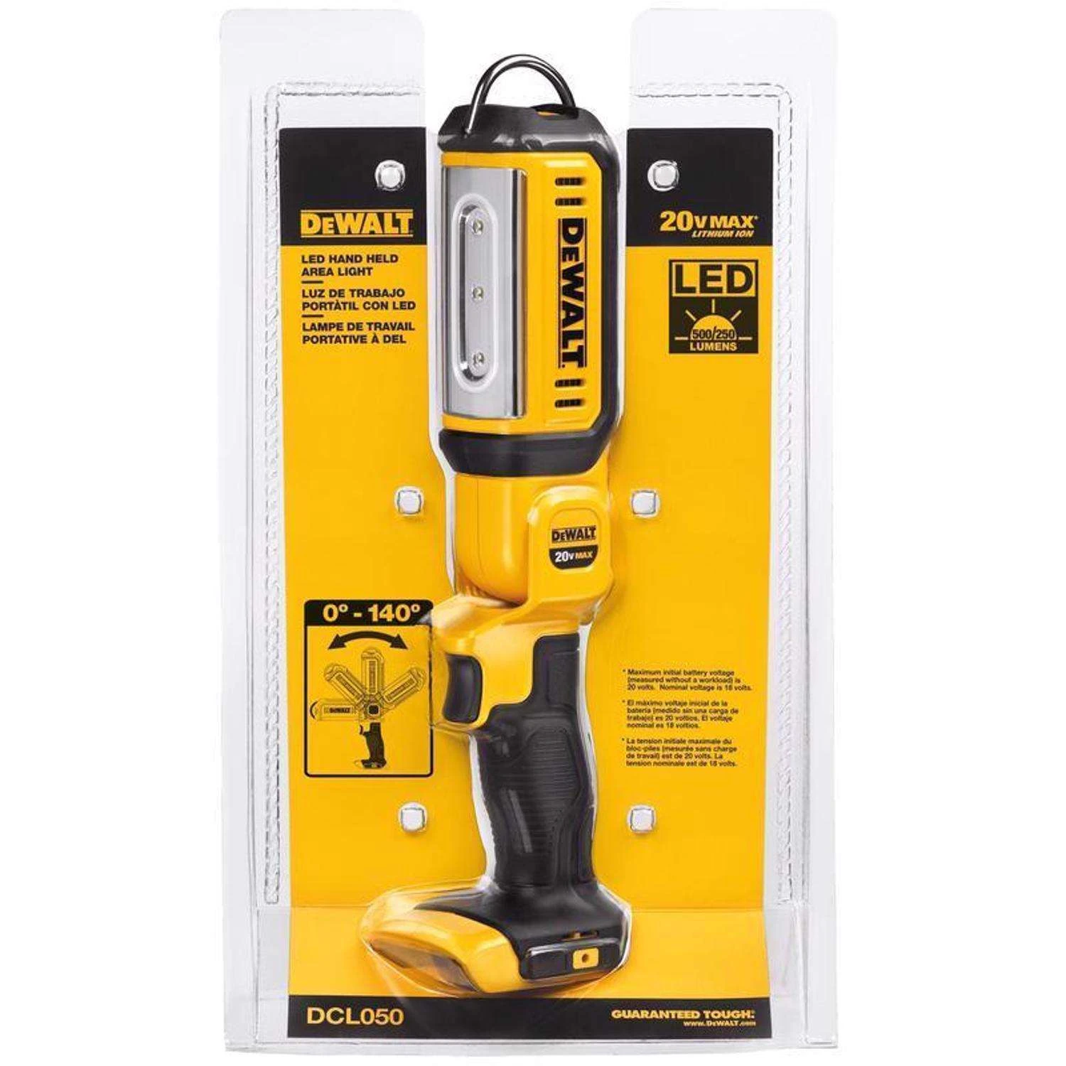 Illuminate dark jobsite work areas with the DCL050 20V MAX LED hand held area light. Battery and charger sold separately. Built-in telescoping and 360-degree rotating hook allows unit to hang from 2 inch materials and multiple locations. Belt hook compatible add belt hook accessory to provide increased versatility for transportation. Over-molded lens cover provides increased durability and a non-marring surface for the jobsite High 1000 lumens and low 500 lumens brightness settings 140 degree pivoting head provides versatility for lighting work surfaces
