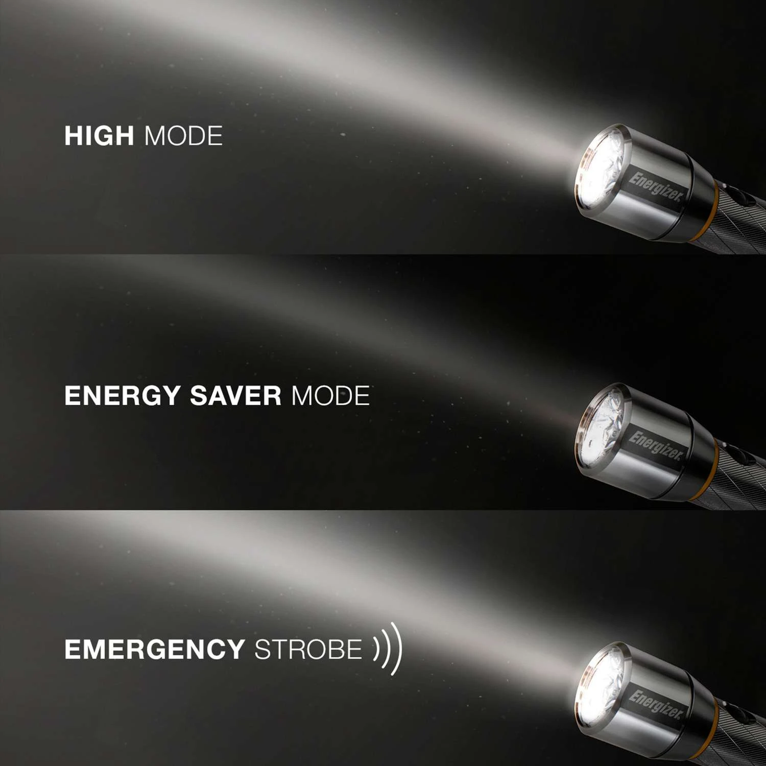 Get crisp daylight in dark spaces any time of day or night: The Energizer Vision HD Extra Performance Metal Flashlight with Digital Focus features MAXVIZ technology for an outstanding beam that replicates natural daylight. That’s a light up to 15 times brighter than standard LED technology produces. Plus, Energizer proprietary Digital Focus Technology allows you optimum control of your light, making it a bright flashlight with even better direct and peripheral vision for up to 230 meters of distance. Early-morning fishing trips, late-night hiking, and even those unexpected blackouts from power outages will be a lot brighter with up to 1300 lumens of broad, high-definition vision. Simply push a button for the brilliance of daylight anytime with the Energizer Vision HD Extra Performance Flashlight with Digital Focus. Energizer Vision HD Extra Performance Metal Flashlight with Digital Focus works with 6 Energizer MAX AA batteries (batteries included) Brightens with up to 15X the power of LED, reaching up to 230 meters with up to 1300 lumens of bright light Durable, aircraft-grade aluminum body with IPX4 water-resistant construction withstands splashing Switches between 3 light modes: high, low, and strobe light Unique MAXVIZ technology replicates daylight color and definition Digital Focus Technology conveniently adjusts from spot to flood light Runs for up to 19 hours in low mode