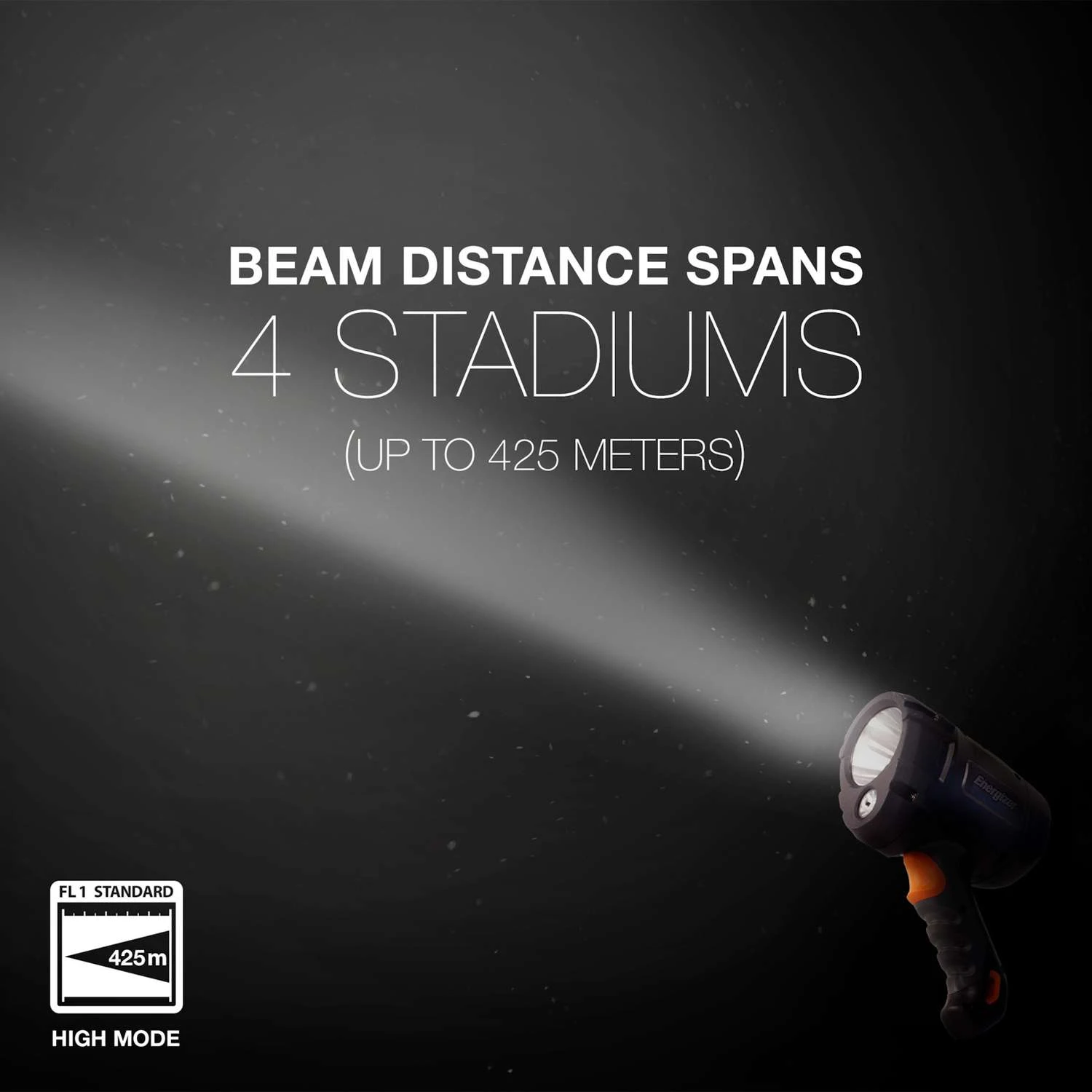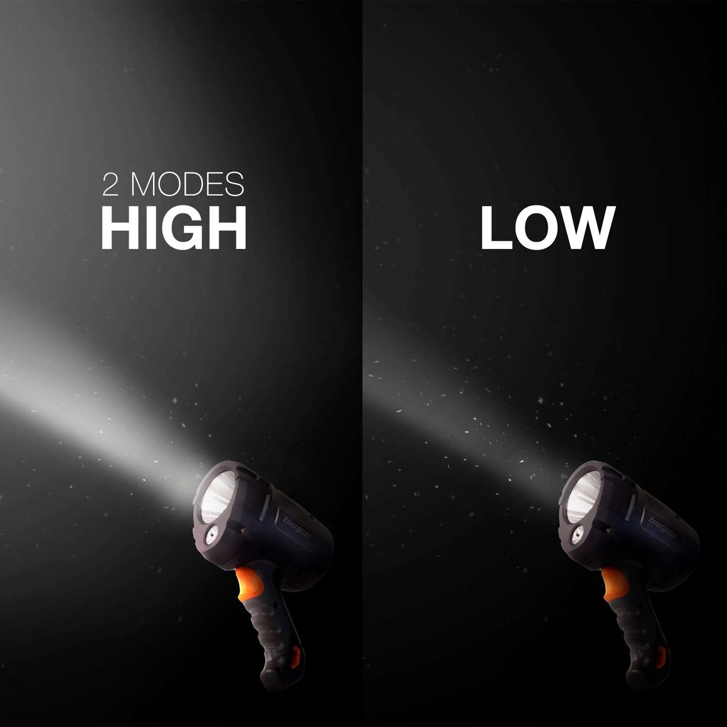 Where long-lasting LED Technology meets powerful distance: Meet the Energizer Hard Case Professional Handheld Spotlight. This LED spotlight powerhouse delivers up to 600 lumens of bright LED light with a long-distance beam that can span the distance of 4 stadiums (we’re talking up to 425 meters). Constructed with rugged steel and rubber outer molding, this durable work light is designed to withstand drops, kicks, and shocks-all with a weather-resistant IPX4 rating-making it dependable even in the most extreme conditions. Go hands-free by hanging the light form the built-in lanyard loop or turn it on its head for a sturdy beam. Add the Energizer Hard Case Professional Spotlight to your toolbox and see further than ever before. A serious powerhouse of light, this spotlight runs on 6 Energizer MAX AA Batteries (included) Powerfully bright with up to 600 lumens and a long-distance beam that can span up to 4 stadium fields (that’s up to 425 meters) Advanced LED Technology delivers bright, uniform light for a variety of jobs Custom light modes allow you to maximize light intensity and runtime (up to 6 hours 15 minutes on high, up to 22 hours on low) Rugged body withstands drop after drop from up to 2 stories high (7 meters) Built-in lanyard loop and flat head give you sturdy, hands-free lighting Ready for any weather with its water-resistant IPX4 rating