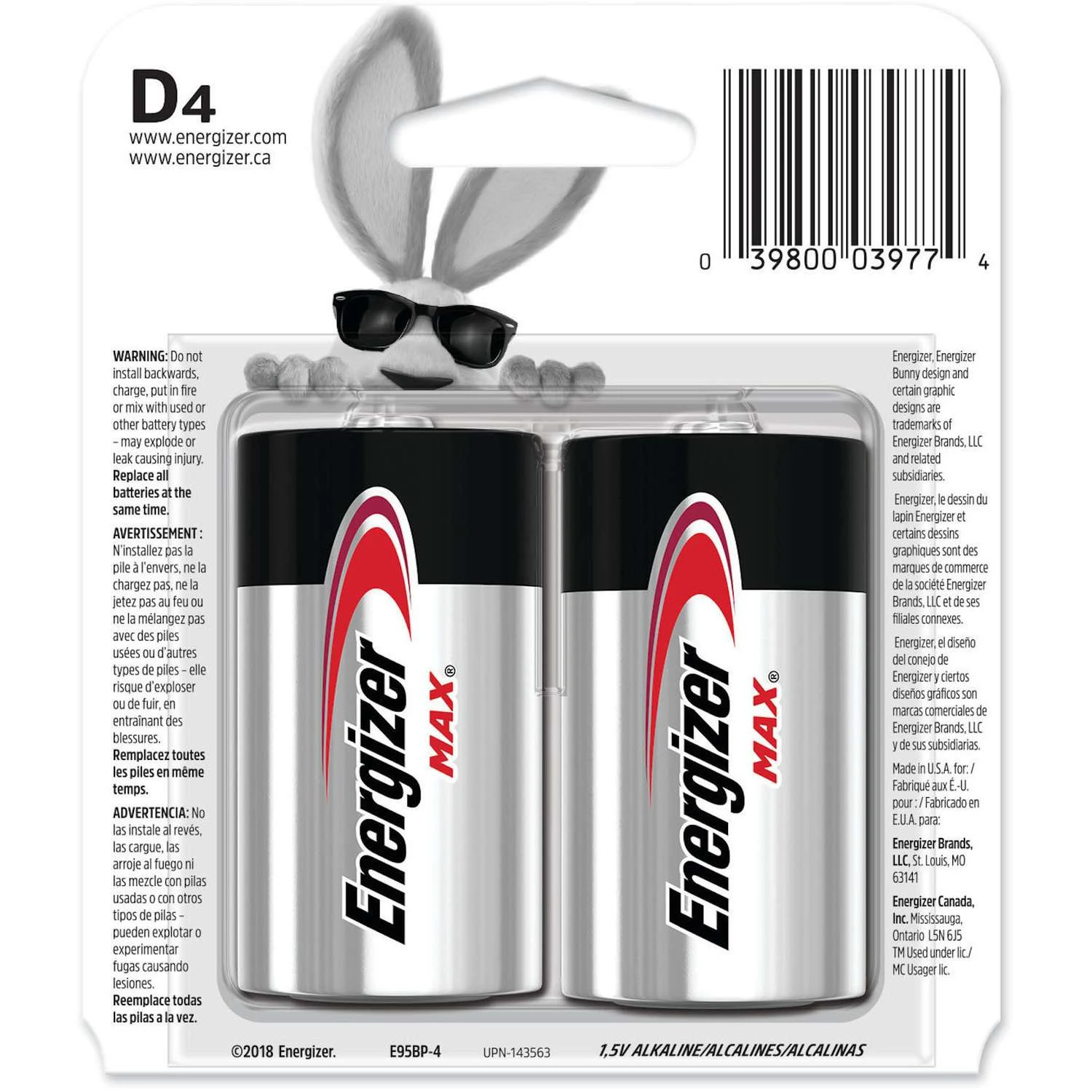 Max Alkaline D Batteries provide a long-lasting power source for such common workplace devices as calculators, pencil sharpeners, cameras, flashlights and portable tape recorders. They also hold their power for up to 10 years while in storage so you have power when you need it most. Batteries are date-coded and 100 percent mercury-free. 4-pack of Energizer MAX alkaline D batteries Our long-lasting MAX D batteries power everyday devices POWERSEAL Technology is the Energizer innovation that delivers energy you can rely on Non-stop energy for your non-stop family’s must-have devices-think toys, flashlights, portable stereos, door chimes, and more Holds power up to 10 years in storage-so you’re never left powerless From the makers of the #1 longest lasting AA battery (Energizer Ultimate Lithium), and the Energizer Bunny Energizer created the world’s first zero mercury alkaline battery (commercially available since 1991), and it hasn’t stopped innovating since.