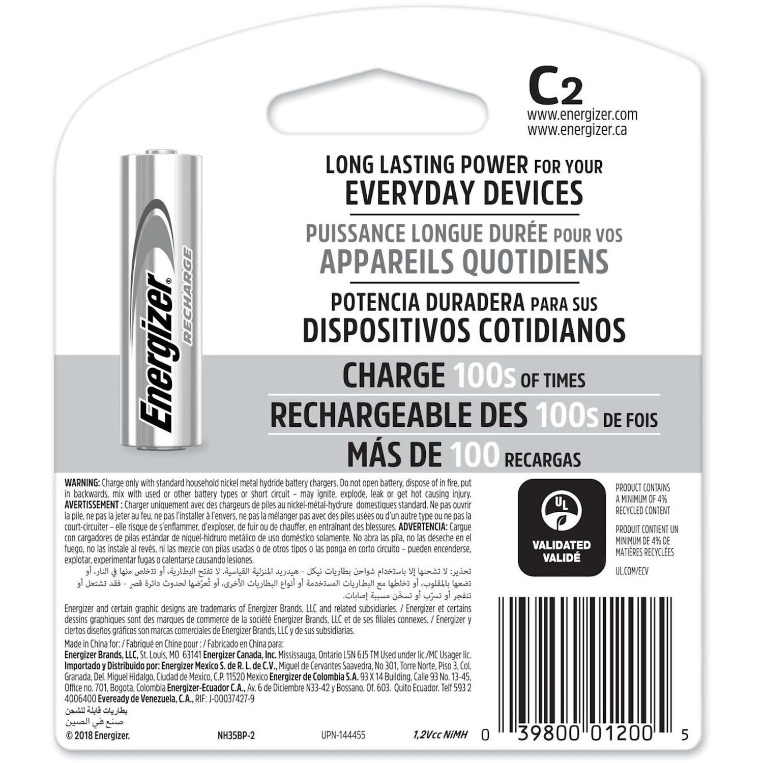 Leading-edge technology makes rechargeable C batteries ideal for the most advanced high-drain devices. These include digital cameras, personal digital assistants (PDAs), handheld electronic games, portable CD players and palmtop computers. When not in use, they can hold their charge for up to 12 months. These batteries can be recharged hundreds of times. For best results, pair your Recharge batteries with Energizer chargers (sold separately). Since these batteries are both renewable and reusable, they are both a good economic and a good environmental choice. 2-pack of Energizer Recharge Universal 2500 mAh NiMH C rechargeable batteries Each battery can be charged hundreds of times, with a charge that can last up to 12 months in storage Extended Life Composition ensures up to 3-year usable battery life under typical usage patterns One charge allows you to enjoy up to 5.5 hours of toy activity (results vary by device and usage) Tops the charts as the world’s #1 recharge Sub Brand, based on scan sales Charger (1081-3574)