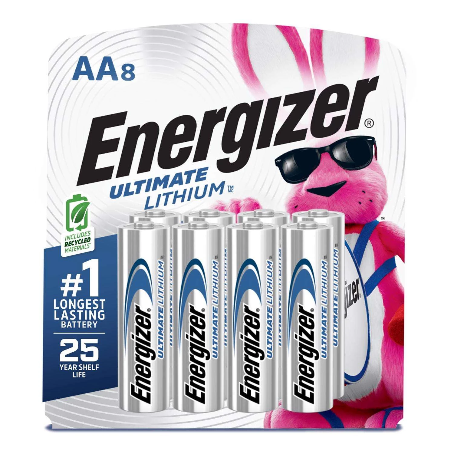 Nothing outlasts Energizer Ultimate Lithium AA Batteries. These household batteries are not only the world’s longest lasting AA batteries, but they also feature leak resistant construction and superior performance in extreme temperatures ranging from -40 degrees F to 140 degrees F. Use these AA lithium batteries to power a variety of high tech and household items, whether you need smoke detector batteries, camera batteries, or double A batteries to power your child’s favorite toys and games. Ultimate Lithium Energizer AA batteries weigh one-third less than standard alkaline batteries, and they hold power for up to 25 years in storage, letting you keep a ready supply available when you need them. To ensure your favorite devices operate at their peak performance, depend on Energizer Ultimate Lithium batteries for work, play and home. * 8 pack of Energizer Ultimate Lithium AA Batteries * Energizer Ultimate Lithium AA batteries are the world’s longest lasting AA batteries * Superior performance in extreme temperatures from -40 degrees F to 140 degrees F ensure reliable use in all seasons * These double A batteries are leak proof batteries, guaranteed based on standard use * Lightweight household batteries last up to 25 years in storage * Includes recycled materials *Steel up to 10% Recycled, excluding 9V * Use in high tech items, like digital cameras or game controllers, and household items such as smoke detectors, toys and games * Feel confident knowing you have the long-lasting lithium power and protection you expect from Energizer *