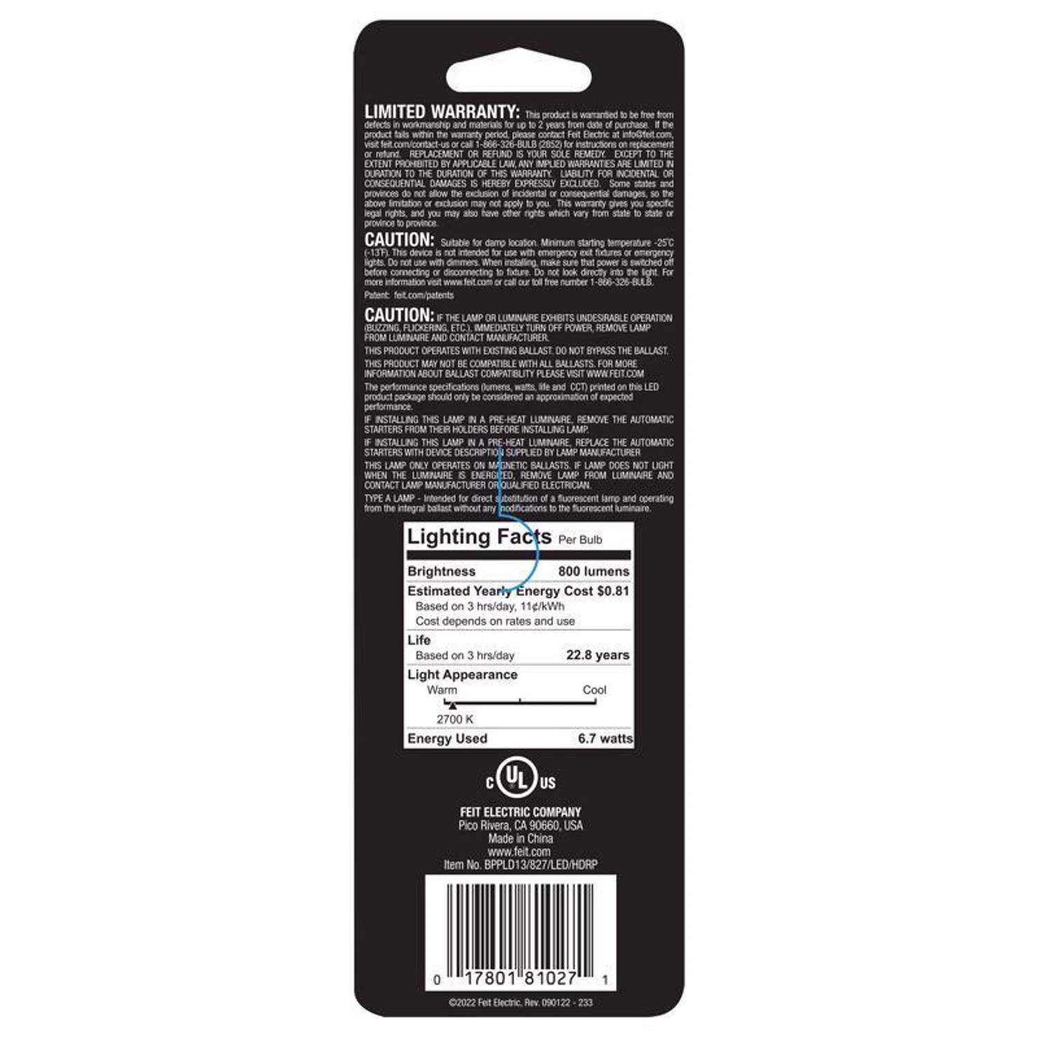 Upgrade your existing 9W PL fixtures to advanced LED energy-saving technology with the Commercial Electric BPPL9/827/LEDG2/HDRP Twin Tube LED Bulb. This 2-pin LED bulb has an output of 600 lumens and a cool 2700k Soft White light, ideal for creating a relaxing, comfortable mood in living rooms and bedrooms. It uses only 5 watts of electricity — up to 44% less than equivalent standard fluorescent bulbs. Commercial Electric G23 Twin Tube PL replacements keep cool regardless of the atmosphere, giving them an average life span of 25,000/22.8 years. They are RoHS compliant and are 100% mercury free, for safer handling and easy disposal. Installation is easy: no ballast replacement or LED driver installation is required. Choose a dependable, general-purpose lighting bulb for residential or commercial applications by choosing Feit Electric. Replaces G23 base bulbs with a compact design that maximizes illumination in smaller fixtures Energy efficient upgrade to fluorescent PL lamps Ideal for living rooms and bedrooms Long life reduces the hassle of replacing bulbs so often Flicker-free instant on illumination, with no warm-up time