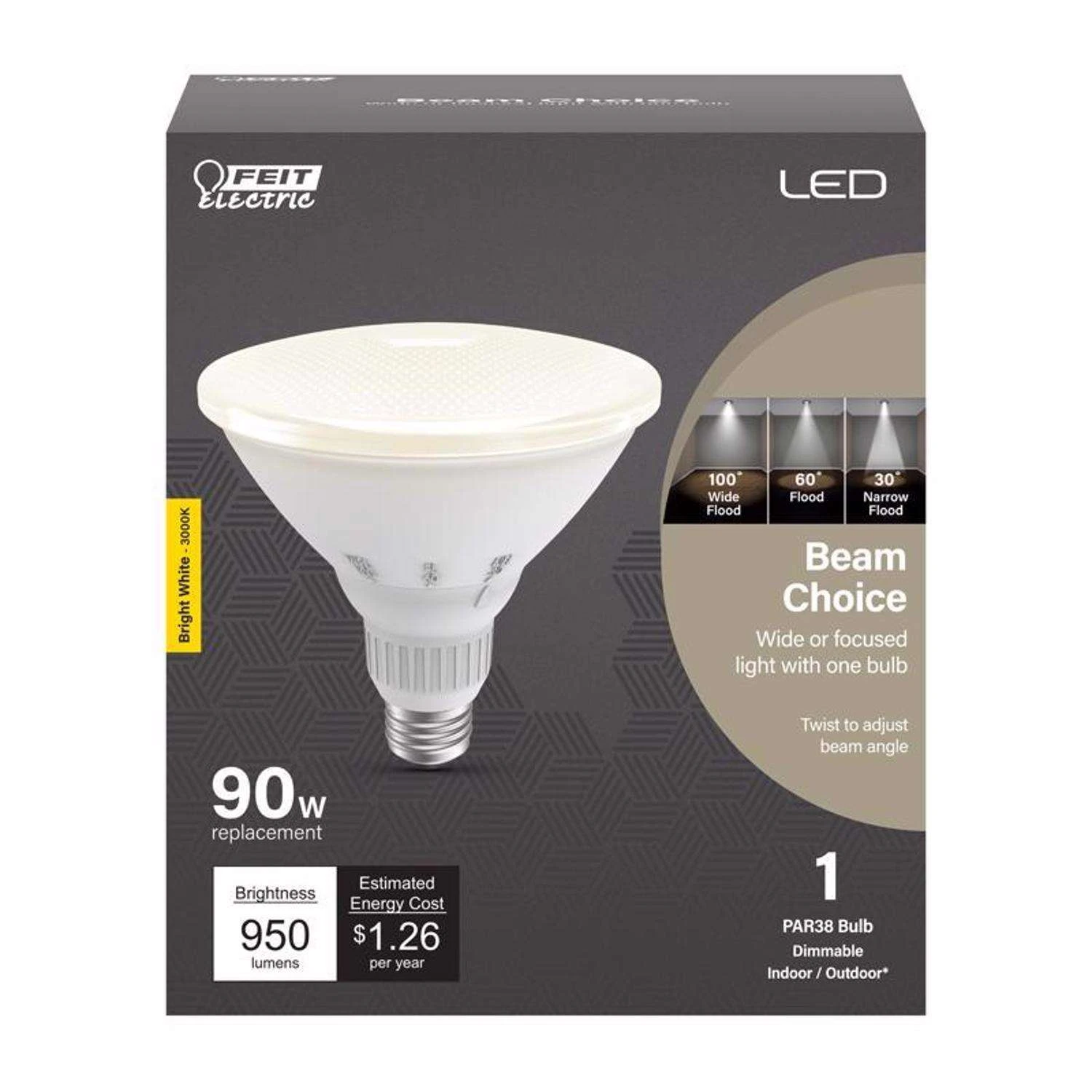 The Feit Electric beam choice LED PAR38 reflector light features an innovative adjustable design so you can get wide or more focused light with just one bulb. With a simple twist the light can be adjusted for different ceiling height, to accent decor or for even light distribution. No additional hardware needed Adjust the beam angle by twisting the top of the bulb Easy to use