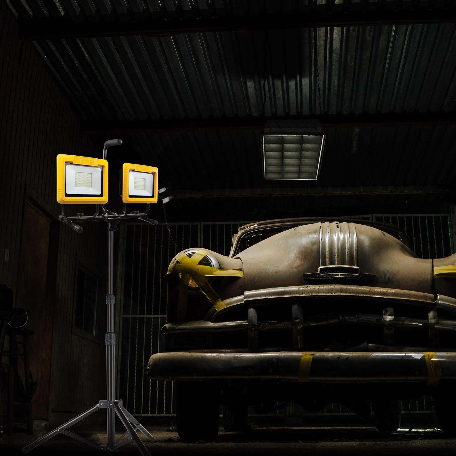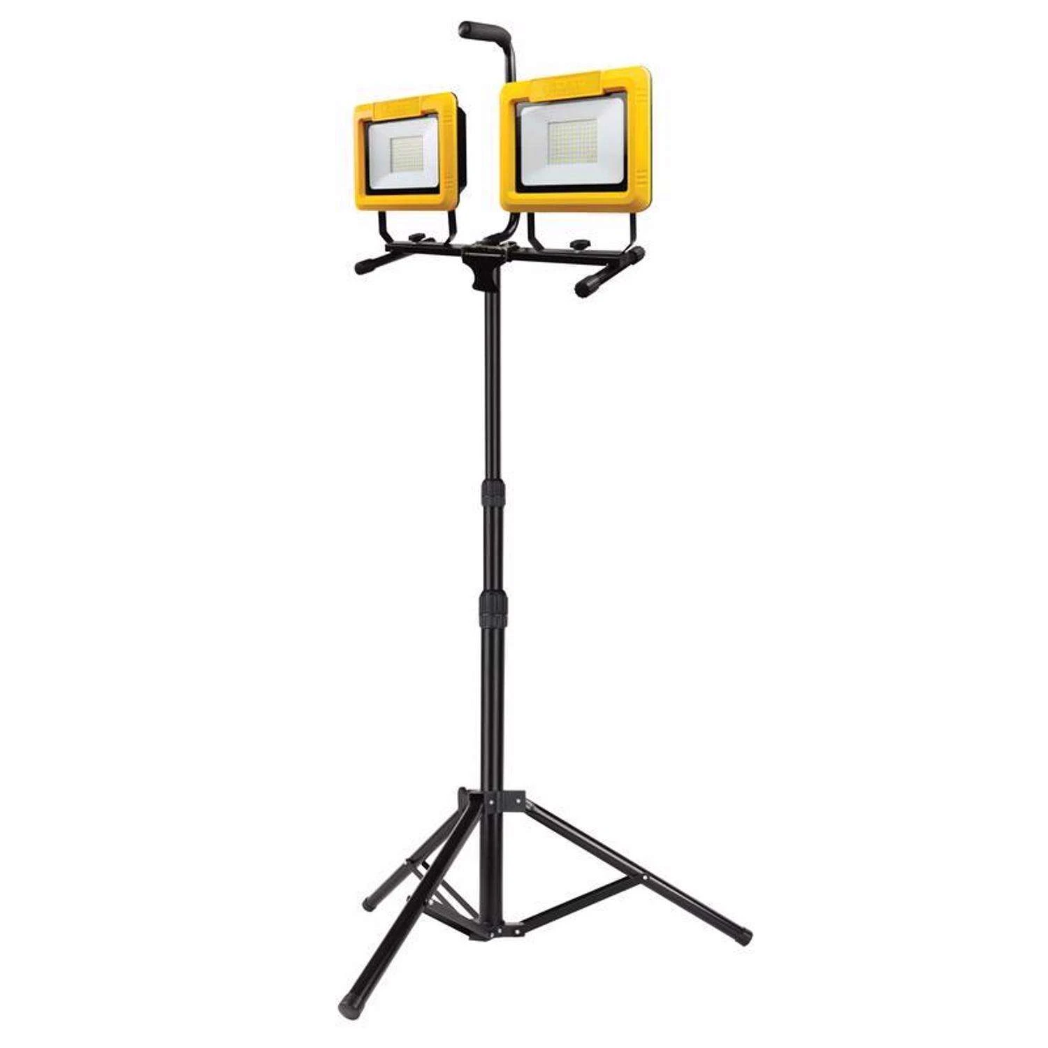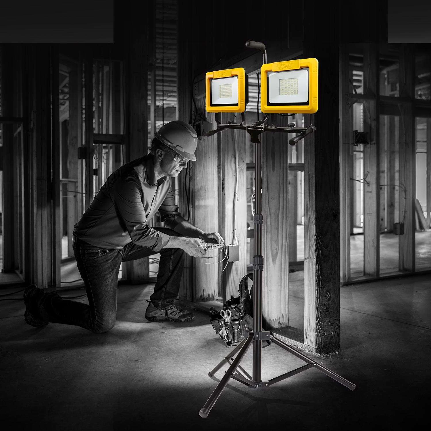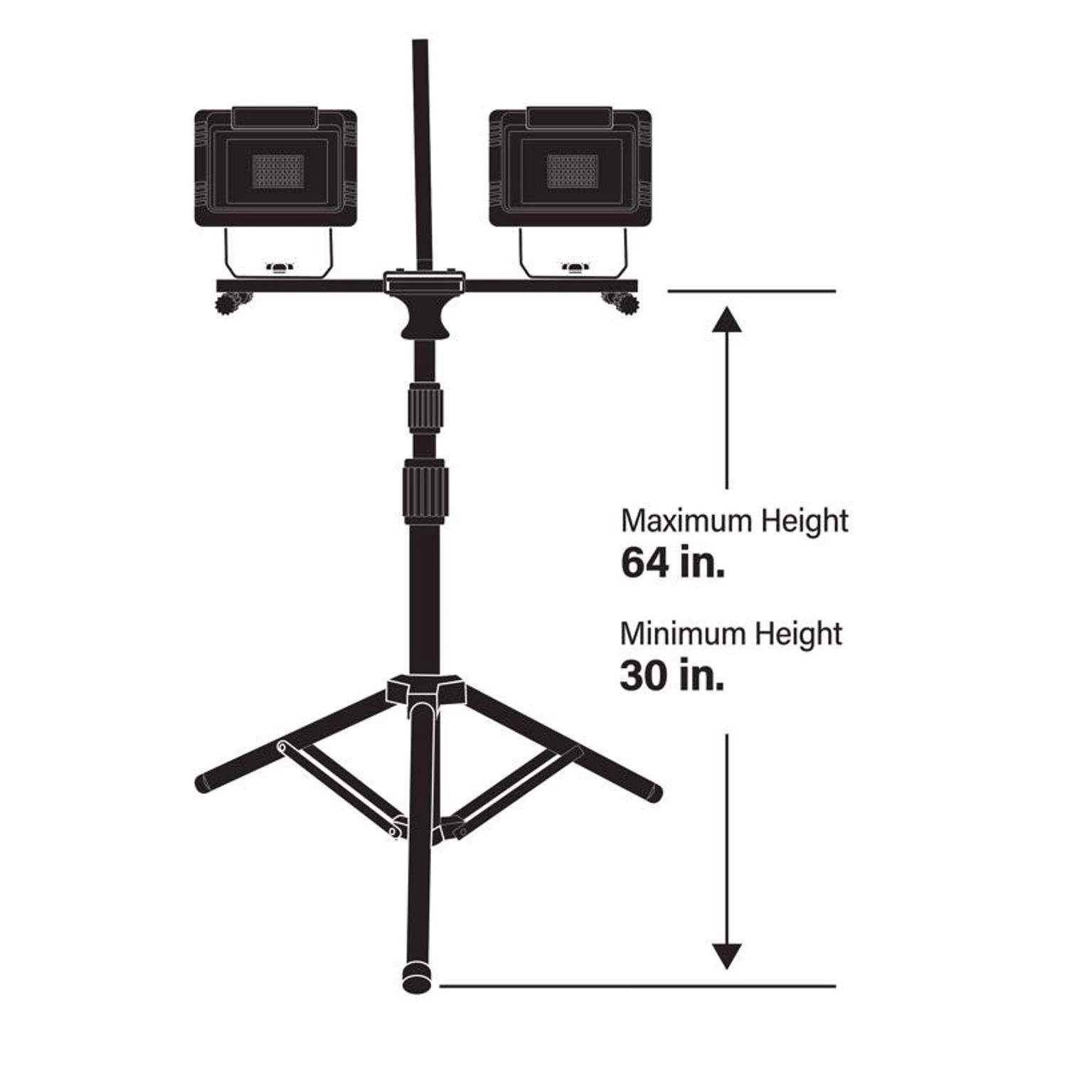 Light up the worksite with the Feit Electric WORK14000XLTPLUG plug-in LED Pro Series work light. Rated IP65 water and dust-resistant, this unit features shock-resistant housing and an 8 ft. heavy-duty 18/3 cord. Two independently movable Integrated LED heads each output a super bright 7000 lumens of 5000K Daylight color temperature light. Each work light comes with an adjustable tripod to focus light exactly where you need it. Choose a Feit Electric work light for your portable lighting needs. Plug-in work light for extra site lighting Dual independent swivel heads each provide 7000 lumens of illumination Optional tripod mount extends from 30 to 64 inches Rated for 30,000 hours of service life Water resistant housing and heavy-duty construction for extra durability