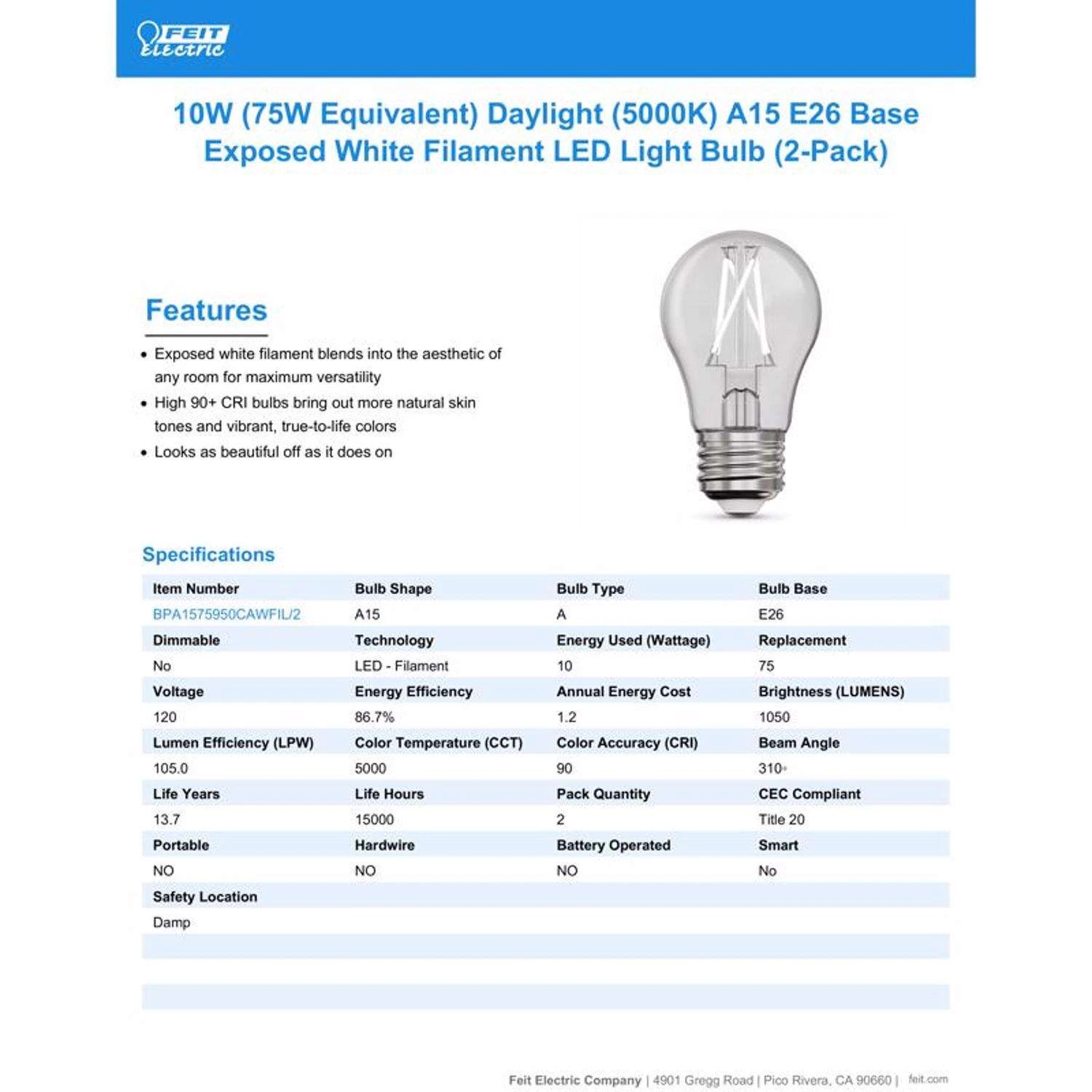 Be the first to review “Feit White Filament A15 E26 (Medium) Filament LED Bulb Daylight 75 Watt Equivalence 2 Pk” Cancel reply