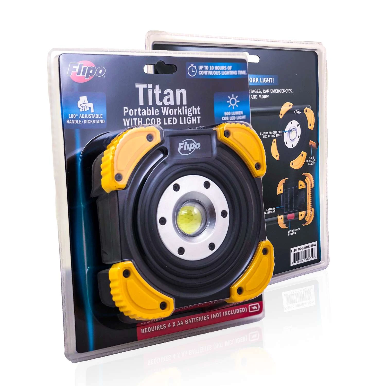 The NEW Portable Worklight from Flipo is the perfect energy saving light for workshops, camping, power outages, car emergencies and more. Use the Titans super bright COB LED 10 Watt floodlight mode or dim low light mode. Work hands-free with light almost any where with the help of the 3-in-1 handle that allows you to adjust light angle 180-degrees. The 3-in-1 handle can also be used as a hanging hook, kickstand and is anti-slip. 2 Illumination functions high, low Features adjustable handle that allows you to adjust light angle 180-degrees Run time of 10 continuous hours on good batteries Multi-purpose kickstand, hanging hook and handle