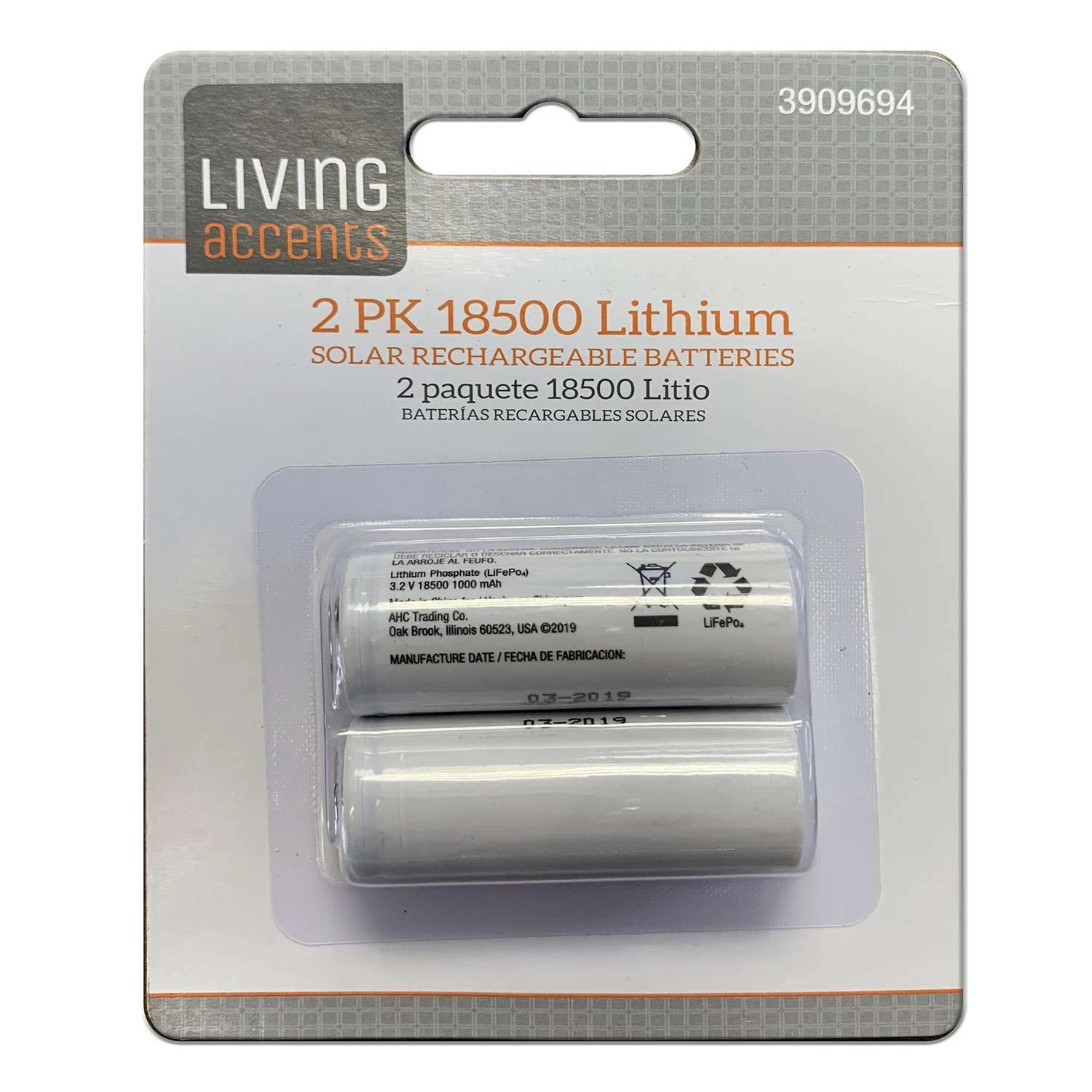 Living Accents Lithium Phosphate 18500 3.2 V 1000 Ah Solar Rechargeable Battery 2 Pk