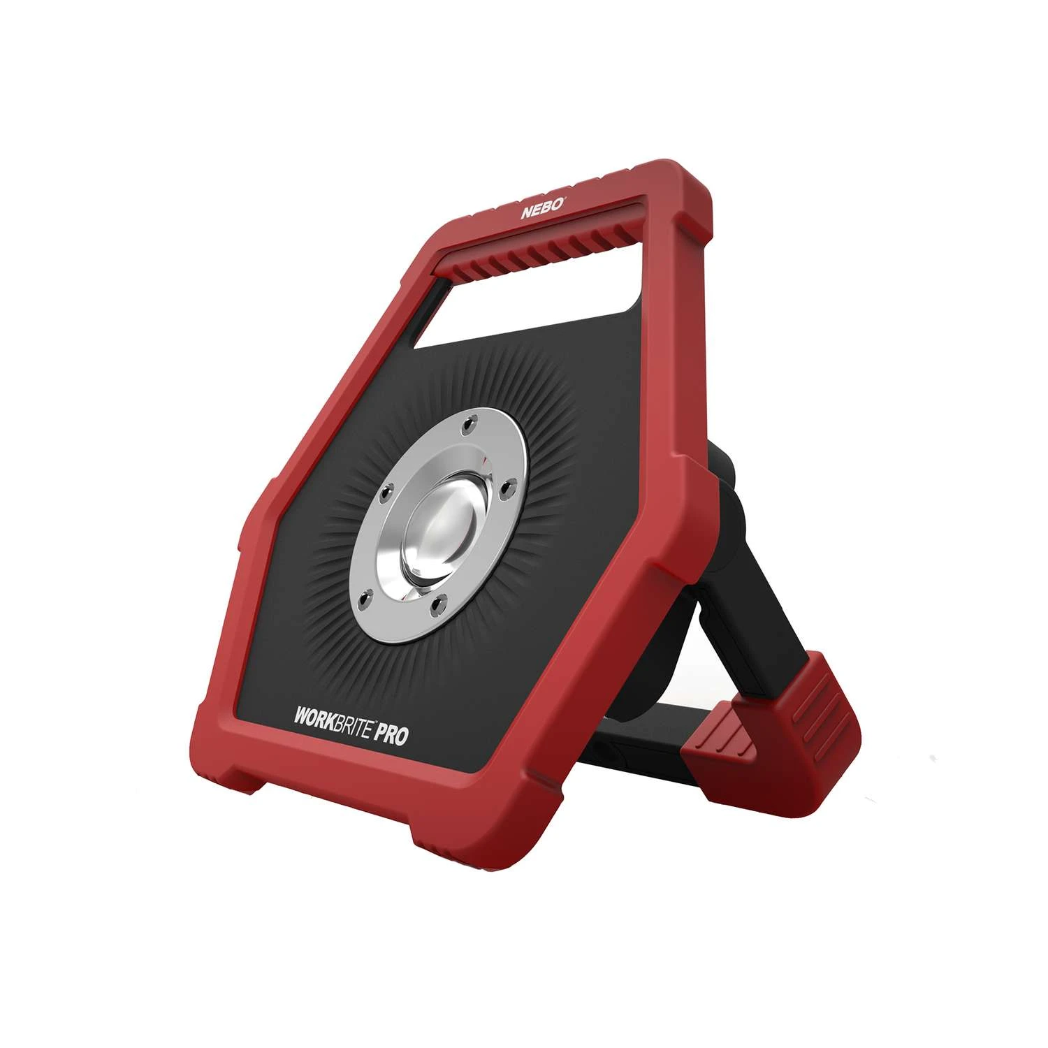 NEBO WorkBrite Pro is a rugged portable work light with a 2000 lumen COB LED and a 180 degree kickstand feature for optimal light positioning. WorkBrite Pro 2000 is powered by “FLEX FUEL” that includes an AC adapter for unlimited run time and 6AA batteries for maximum brightness and portability. The WorkBrite Pro will also work with 3AA batteries with slightly reduced performance. Die-Cast Aluminum frame/heat sink with contractor grade rubber coating allows the WorkBrite Pro to be used anywhere under any condition. 2000 lumen COB worklight 180 degree tilt kickstand for optimal light positioning Rugged housing Includes AC adapter for unlimited run time 6 NEBO AA batteries provided Portable Aluminum frame