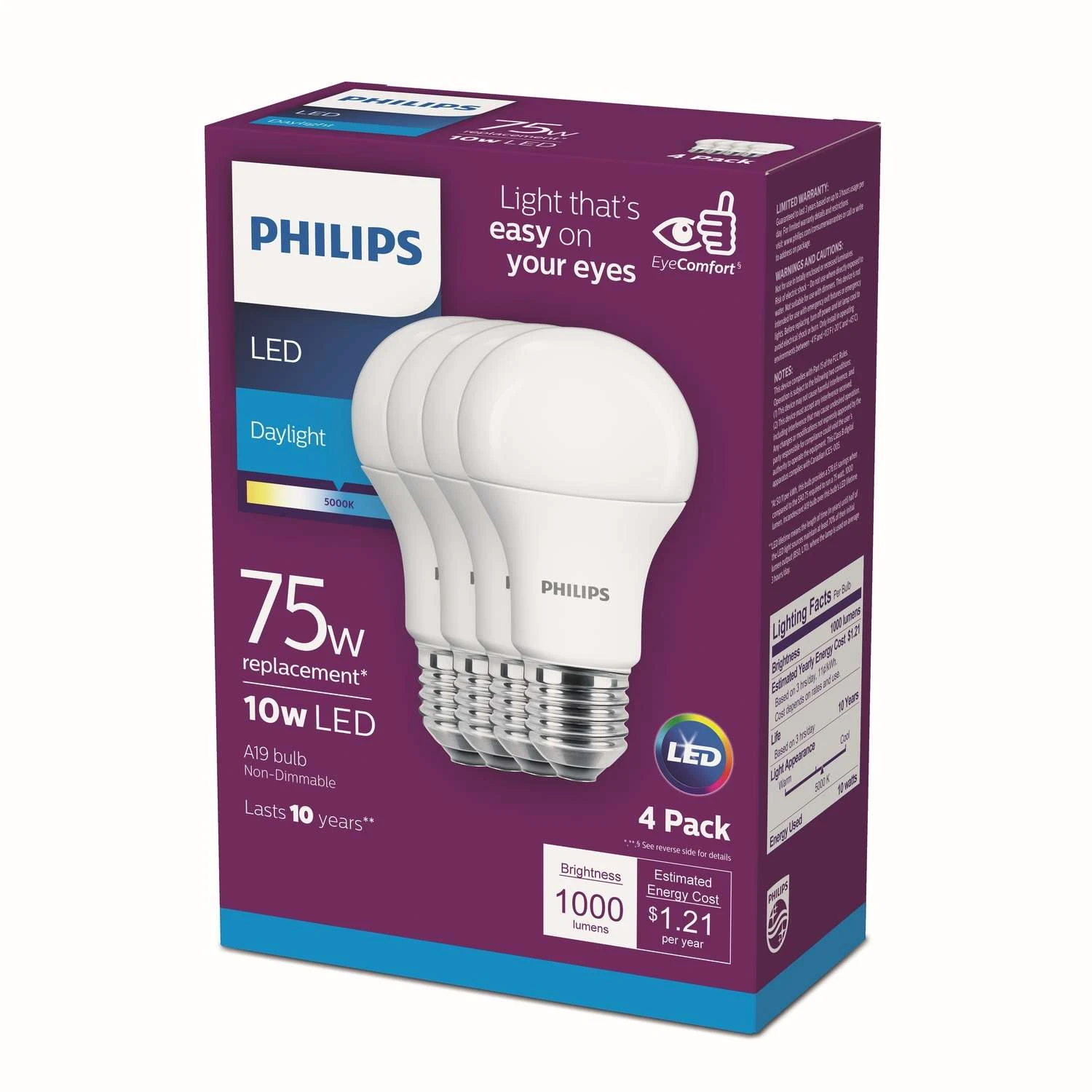 Philips A19 E26 (Medium) LED Bulb Daylight 75 Watt Equivalence 4 Pk