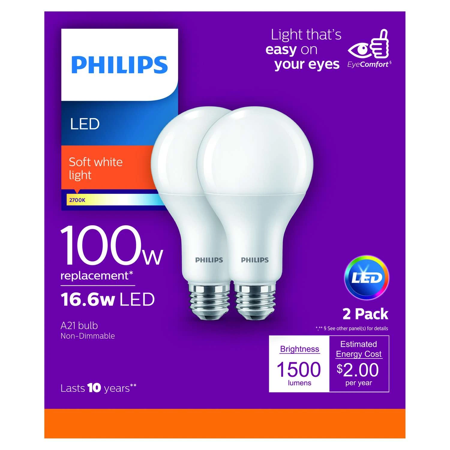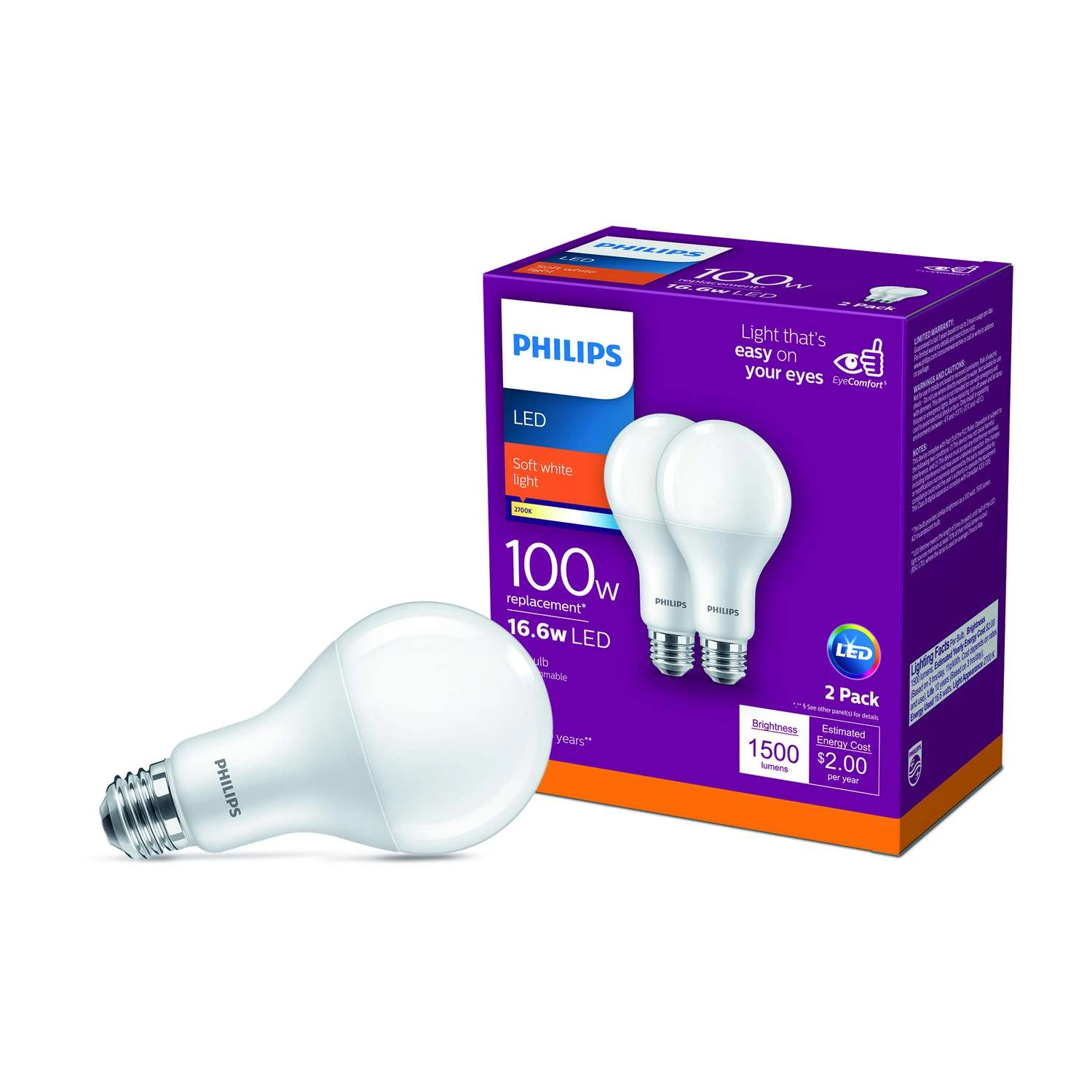 Philips A21 E26 (Medium) LED Bulb Soft White 100 Watt Equivalence 2 Pk