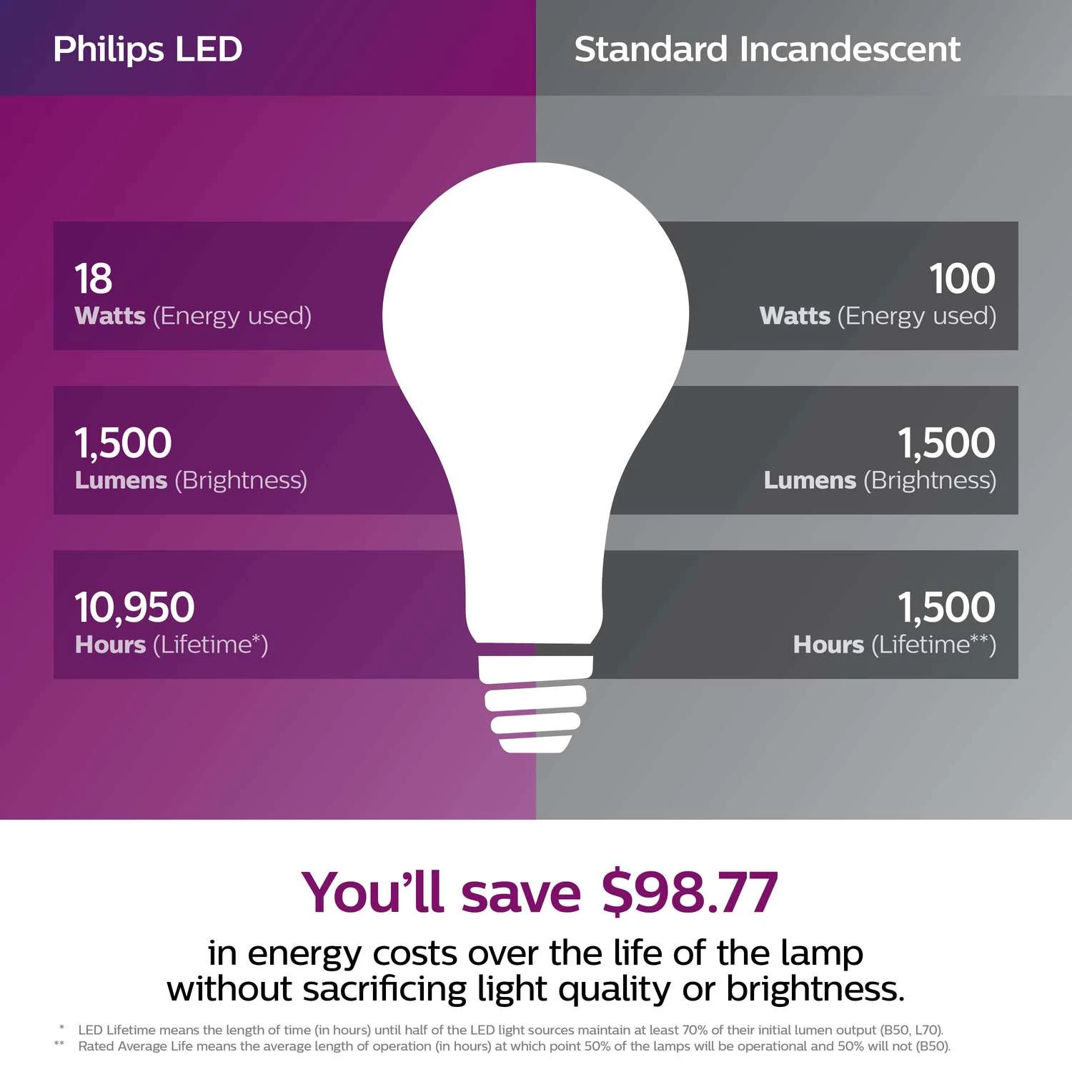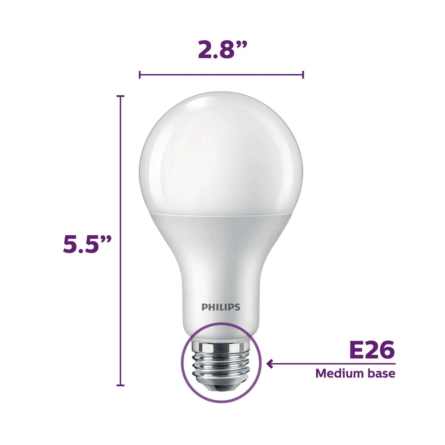 This dimmable Philips A21 Energy Star LEDs uses only 16.6 Watts compared to the equivalent conventional bulb. Use anywhere traditional light bulbs are located such as table or floor lamps. Ideal for locations that require significant light. Meets strict test criteria including flicker, strobe, glare, and color rendition to achieve EyeComfort requirements. EyeComfort rated LED – Provides high quality light thats easy on your eyes Smooth Dimming Silent, flicker free and tested to work with the most dimmer switches CRI 90 Produces vibrant color and detail ENERGY STAR and Title 20 Certified
