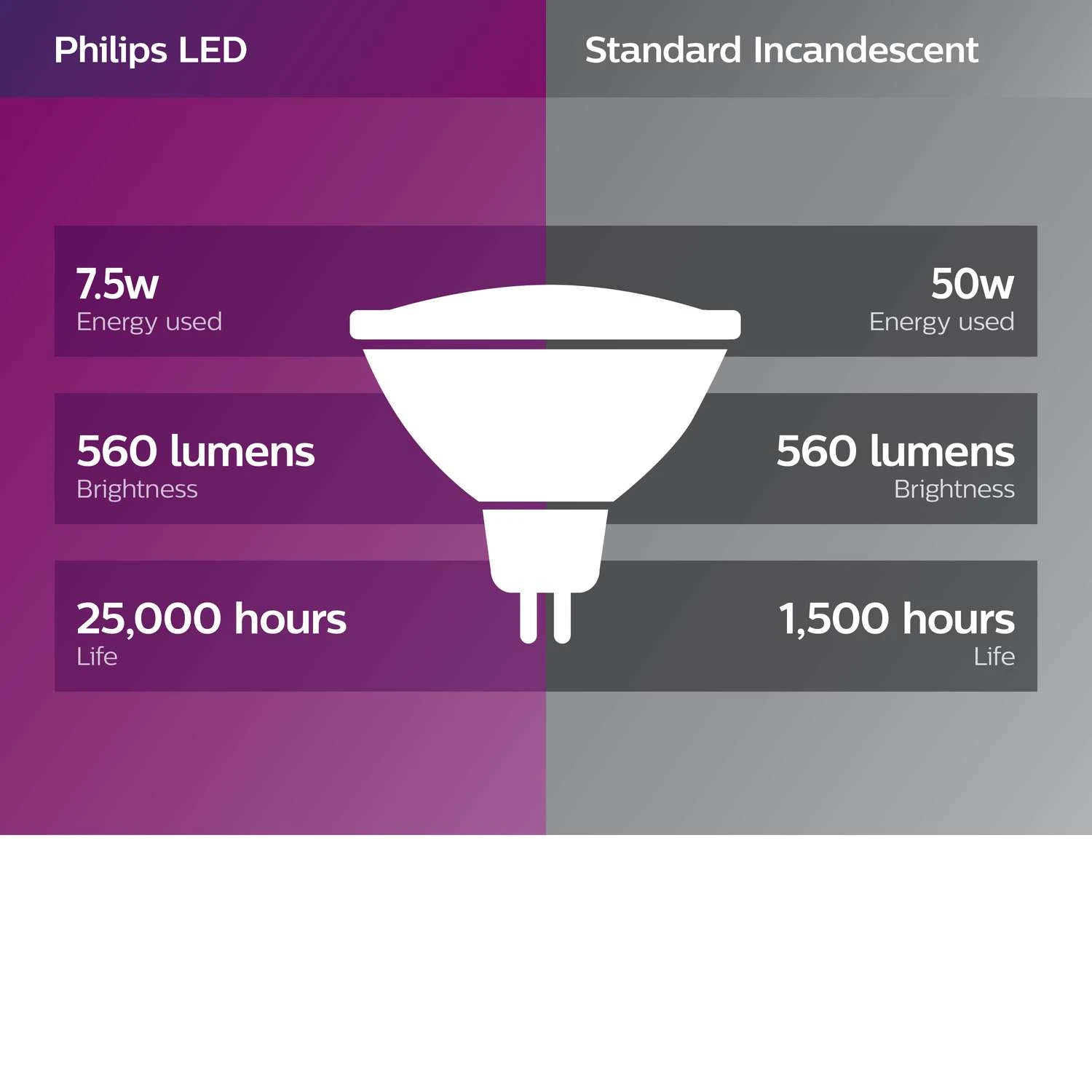 Get energy savings and 15x the life with Philips 7.5 Watt MR16 LED light bulb vs an equivalent 50 Watt incandescent. Classic Glass design provides bright white light. Ideal for use in kitchens, living rooms and dining rooms in recessed can and track light fixtures. EyeComfort rated LED – Provides high quality light thats easy on your eyes Smooth Dimming Silent, flicker free and tested to work with the most dimmer switches 12 volt is perfect for landscape lighting Ideal for locations that need quality light ENERGY STAR and Title 20 Certified