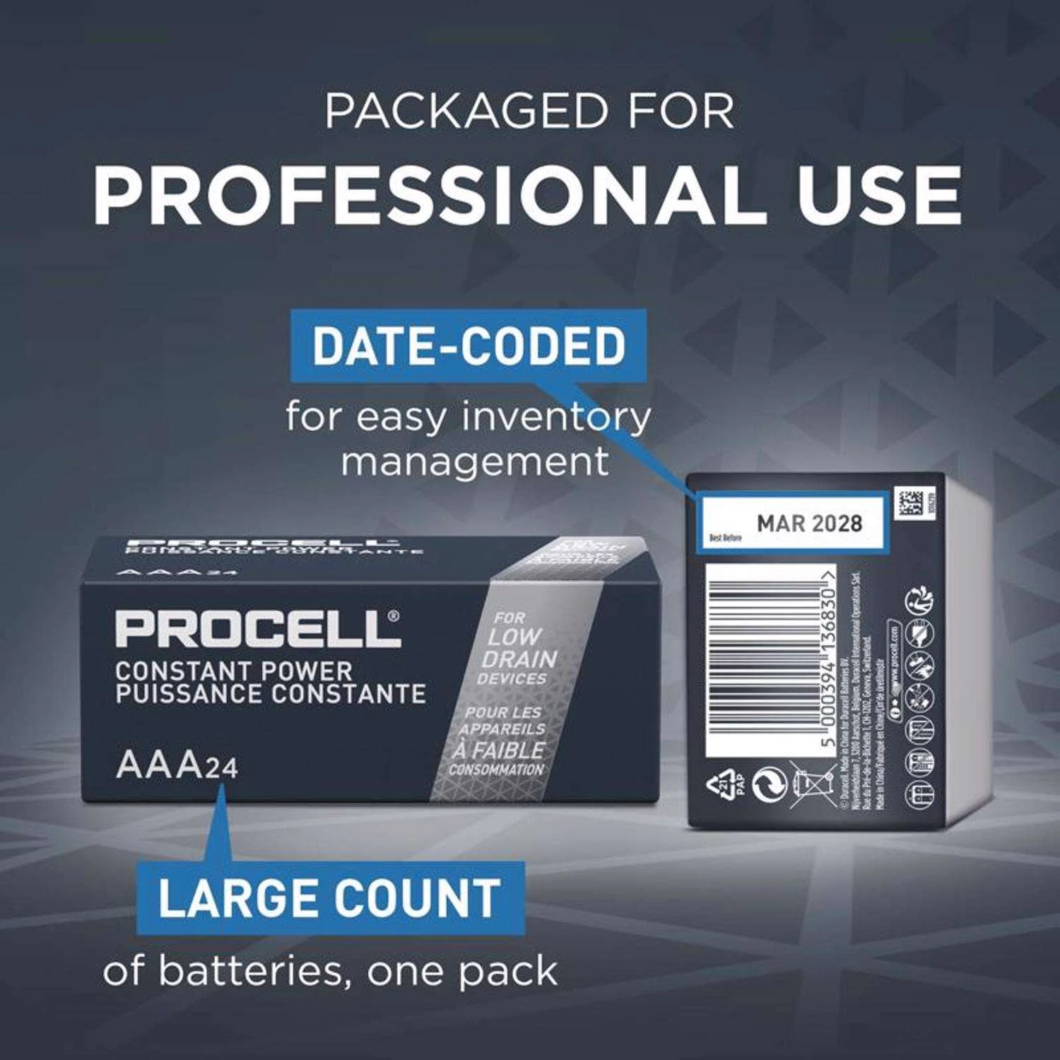 Procell Professional Alkaline AAA industrial batteries are general purpose batteries, ideal for powering mid and low drain professional devices, such as security keypads, remote controls and glucometers. Manufactured using superior cell design (vs. prior Procell Alkaline AAA batteries) to ensure high-quality cell construction. Each battery comes with a ‘quality warranty’. Design, safety, manufacturing and qualification follow Procell��s stringent battery standards, which incorporate parts of the ANSI and IEC battery standards. B2B battery for professional use only. Pro battery Procell Constant line can be used for low-drain professional devices, such as security keypads, remote controls and glucometers. Economically packaged in bulk and individually date-coded for effective inventory management Used by manufacturers around the world – Procell Alkaline batteries have been designed in collaboration with manufacturers to work best in professional devices Equivalent to LR61, AM6, 25A , E96, EN96, GP25A, LR8D425, 4061, K4A Operating temperatures from -4 degrees fahrenheit to 129.2 degrees fahrenheit Reliable long-lasting power (vs. prior Procell Alkaline AAA batteries) Completely redesigned for longer lasting*, consistent performance in low-to-medium drain professional devices that require a constant drain. 7 Year Best Buy Date